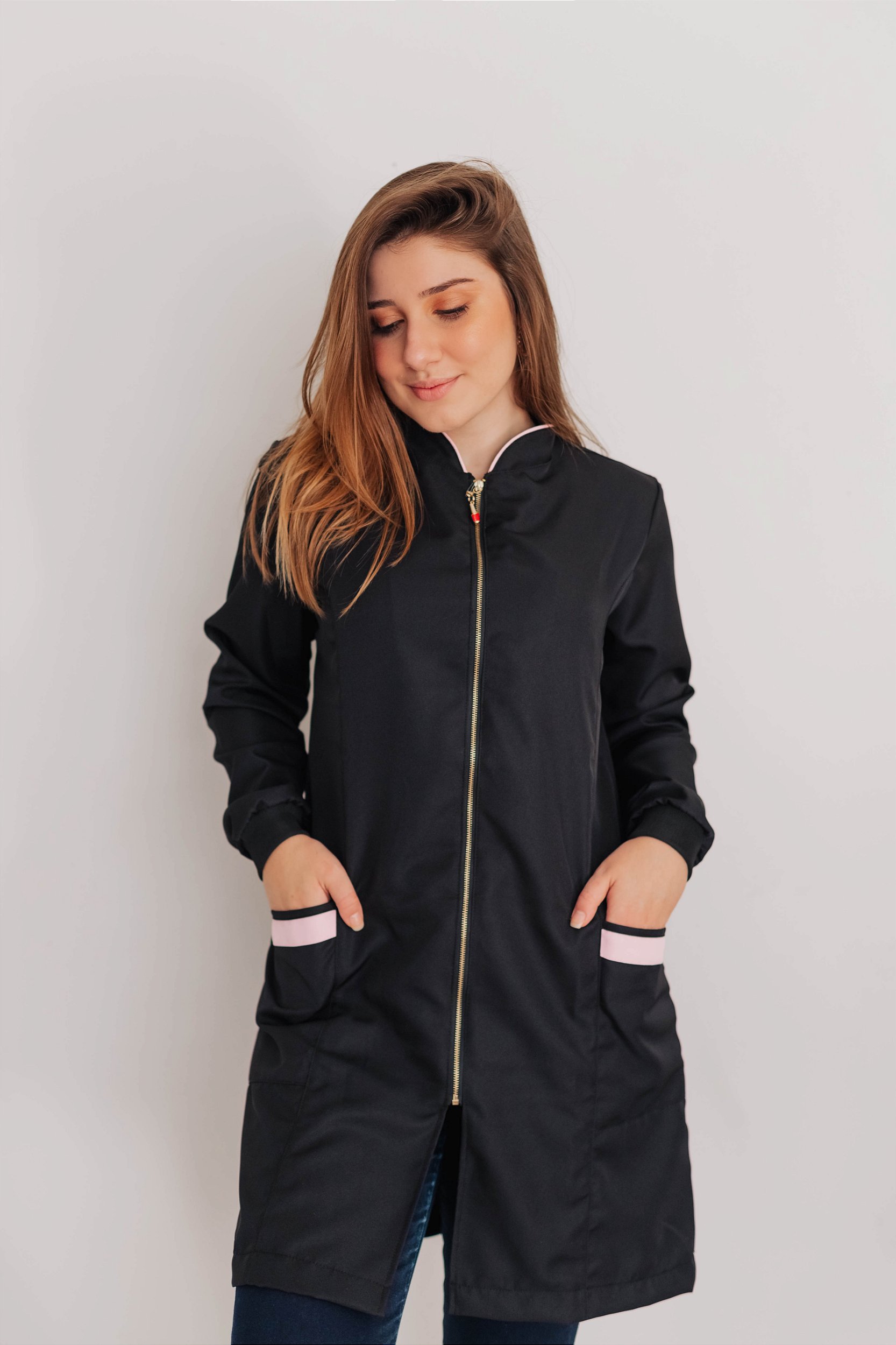Jaleco feminino acinturado gola padre, com detalhes na gola, bolsos e faixa costas.