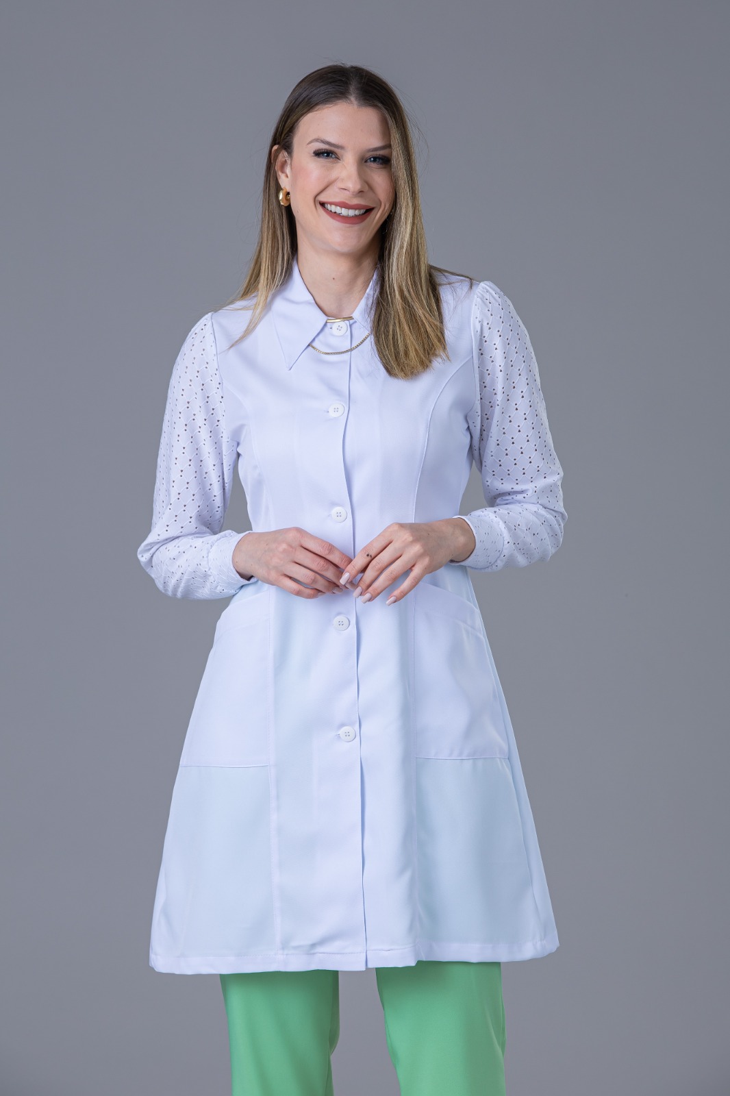 Jaleco confeccionado com tecido bi-stretch e laise de alta qualidade, garantindo durabilidade e conforto no seu dia a dia.